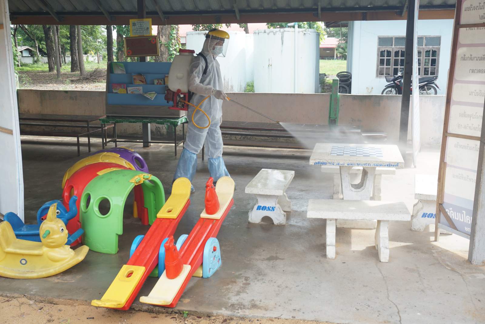 "เจ้าหน้าที่องค์การบริหารส่วนตำบลโนนค้อ ออกพื้นที่ฉีดพ่นน้ำยาฆ่าเชื้อตามโรงเรียนและศูนย์พัฒนาเด็กเล็กในตำบลโนนค้อ เพื่อสร้างความมั่นใจก่อนเปิดภาคเรียน"