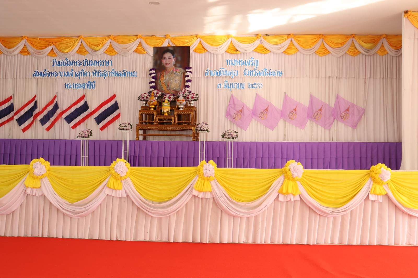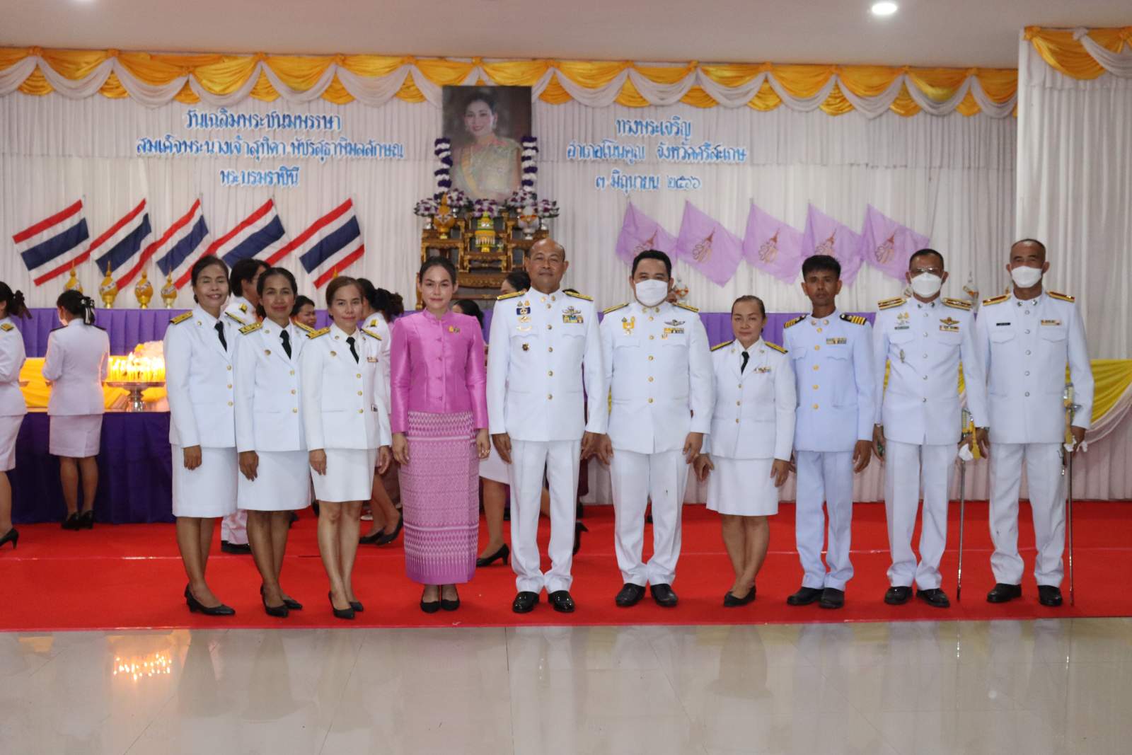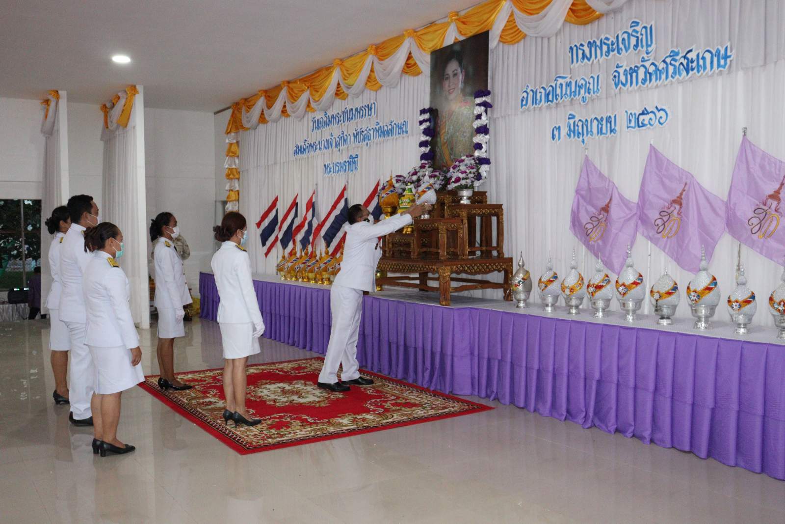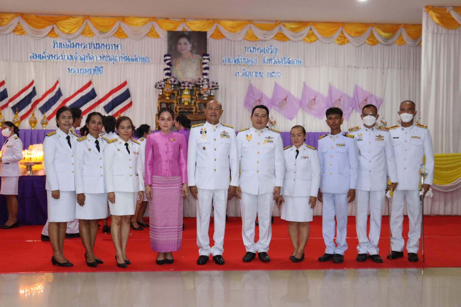 เวลา 07.30 น. วันที่ 3 มิถุนายน 2566 ณ หอประชุมที่ว่าการอำเภอโนนคูณ จังหวัดศรีสะเกษ ได้จัดพิธีทำบุญตักบาตรเนื่องในโอกาสวันเฉลิมพระชนมพรรษา สมเด็จพระนางเจ้าสุทิดา พัชรสุธาพิมลลักษณ พระบรมราชินี เพื่อถวายเป็นพระราชกุศล โดยมีนายโกวิท แก้วสุขอยู่เจริญ นายอำเภอโนนคูณ เป็นประธานในพิธี องค์การบริหารส่วนตำบลโนนค้อ โดยนายกรีฑา เครือคุณ นายกองค์การบริหารส่วนตำบลโนนค้อ มอบหมายให้นายคำภา สร้อยรอด นำสมาชิกสภาองค์การบริหารส่วนตำบลโนนค้อ ข้าราชการ ข้าราชการครูโรงเรียนในสังกัด พนักงานส่วนตำบลองค์การบริหารส่วนตำบลโนนค้อเข้าร่วมในพิธี หลังเสร็จสิ้นพิธีในช่วงเช้า เวลา 17.30 น. ณ หอประชุมที่ว่าการอำเภอโนนคูณ นายโกวิท แก้วสุขอยู่เจริญ นายอำเภอโนนคูณ นำหัวหน้าส่วนราชการทุกส่วน ผู้บริหารท้องถิ่นทั้ง 5 ตำบล หน่วยรัฐวิสาหกิจ และภาคประชาชน ร่วมถวายวางพานพุ่มดอกไม้ กล่าวถวายราชสดุดีและถวายบังคมหน้าพระบรมฉายาลักษณ์ สมเด็จพระนางเจ้าสุทิดา พัชรสุธาพิมลลักษณ พระบรมราชินี เพื่อแสดงความจงรักภักดีและน้อมรำลึกในพระมหากรุณาธิคุณ เนื่องในวันคล้ายวันเฉลิมพระชนมพรรษา สมเด็จพระนางเจ้าสุทิดา พัชรสุธาพิมลลักษณ พระบรมราชินี